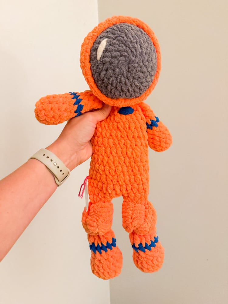 Astronaut snuggler! Orange with royal blue accents. 17” long. Unstuffed except for helmet. Perfect for babies!