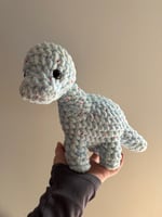 Baby Bronto is just under 8” tall! He can be ordered any color, with plastic safety eyes or embroidered for baby safety.