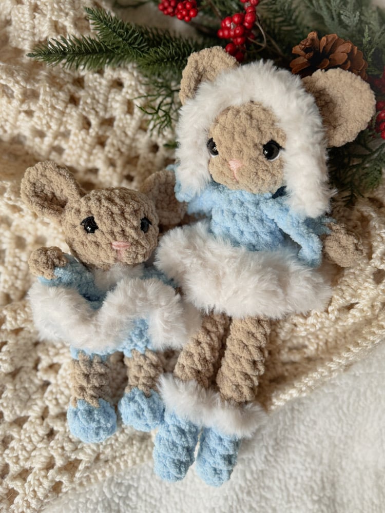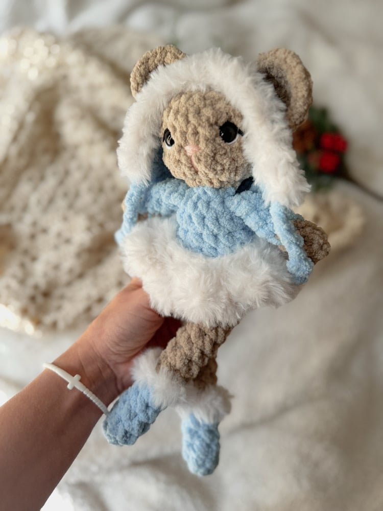 Brie mouse comes with a removable bonnet and tutu! She is 13” from tip of ear to toe. Safety eyes are used, and though reinforced, they are not recommended for use by children under the age of 3