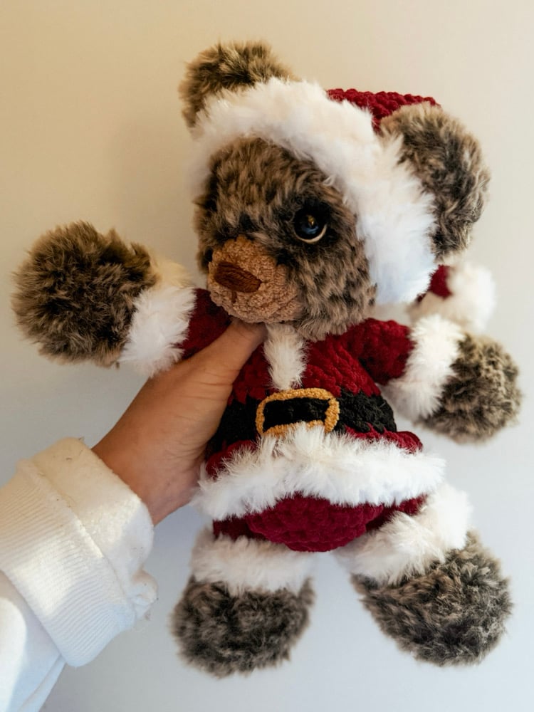 Cocoa Bear! Made with fur yarn. Hat is removable. Made with safety eyes, not for children under 3. He is appx. 12” tall. Spot clean only.