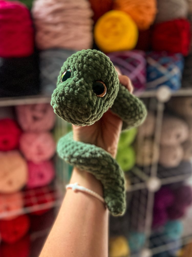 Snake is self curling/coiling - the shape is crocheted in. You can choose eye color, and snake color - including stripes! This one was stolen by my 5yo and is currently lost in the house, so I can’t measure him or post more photos 🫠😂 but it can be made as long as you like!