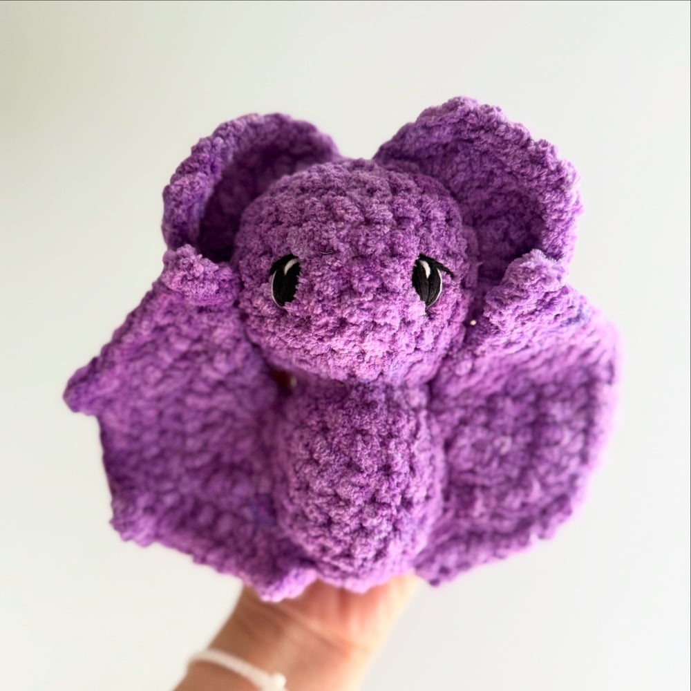 Echo the bat - pattern by Pawgsy Place. Embroidered eyes safe for all ages! Purple color may vary; it is made with a color phasing yarn