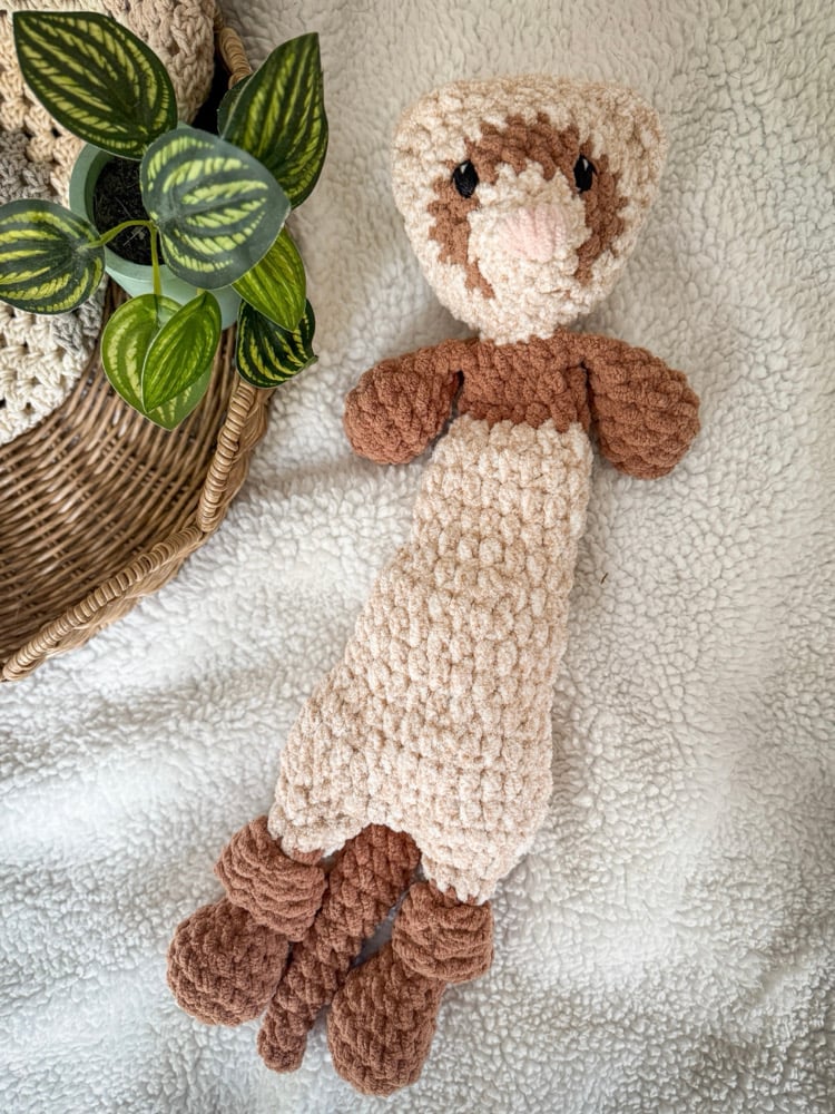 Ferret Snuggler! 18” tall. Head is stuffed with poly-fil, body has 150g of weighted poly-beads inside (similar to beanie baby). Embroidered eyes. Beads are secured and double wrapped in nylon, but because of their size this product is not for children under 3.