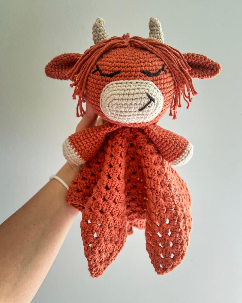 Made with 100% cotton. Safe for all ages. Blanket attached is star shaped instead of square. Blanket is just over 12” in diameter, and measures 12” from tip of horns to tip of blanket.
