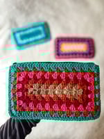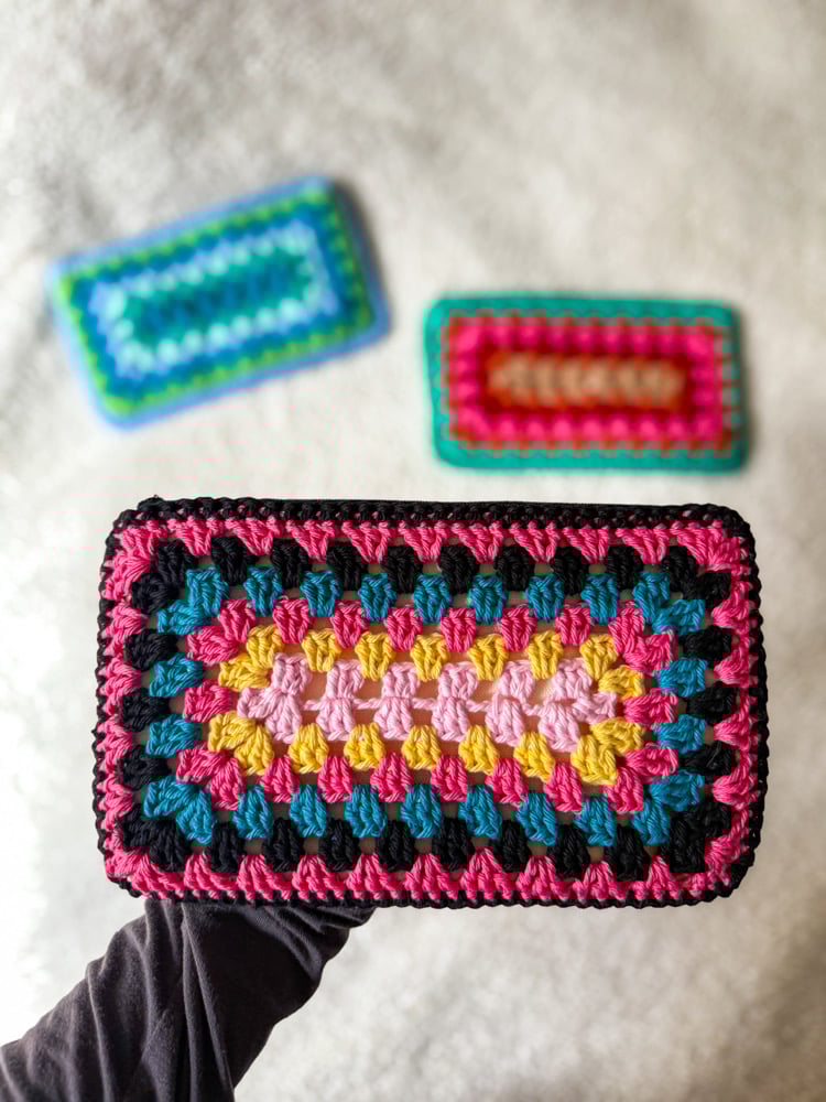 Zippered pouch interior measures 8.3”x5”. Made with 100% cotton yarn. Can be ordered in any color combination/order that you like using 1-7 colors.