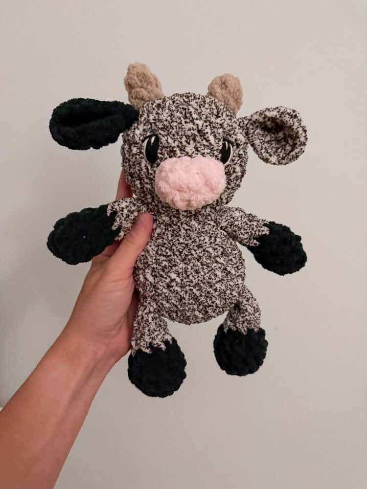 MooMoo the Cow! 11” tall. Embroidered eyes make him safe for all ages.
